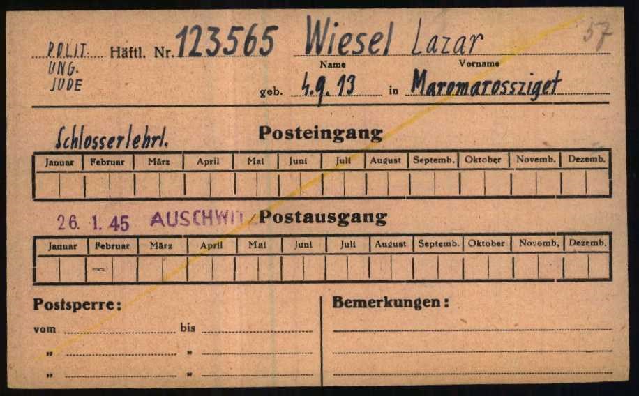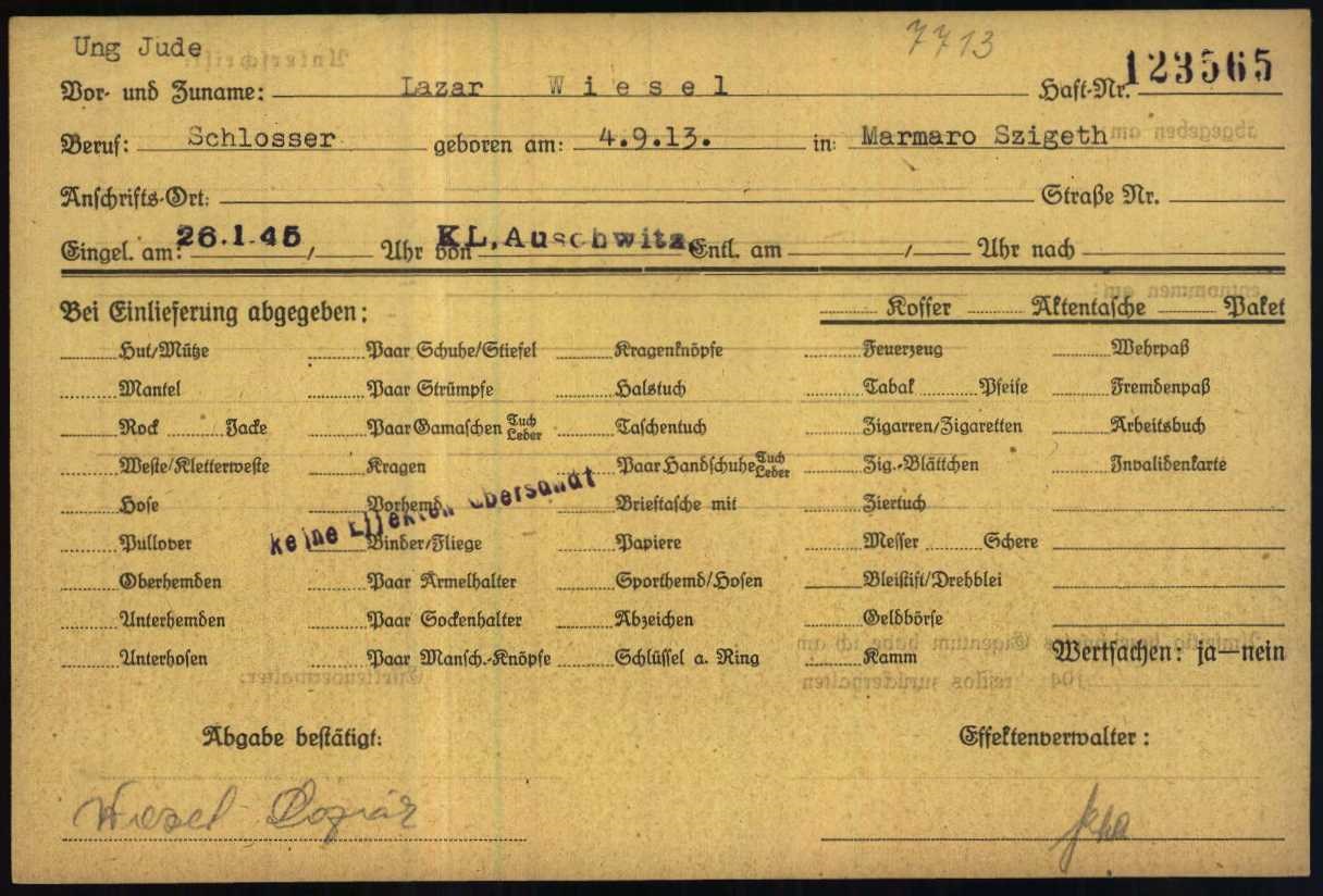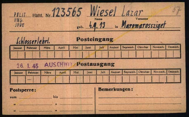 To remind our readers: according to Elie Wiesel (1928-2016) in Auschwitz he had the number (and a corresponding tattoo) A-7713, his father Shlomo Wiesel had the number A-7712.