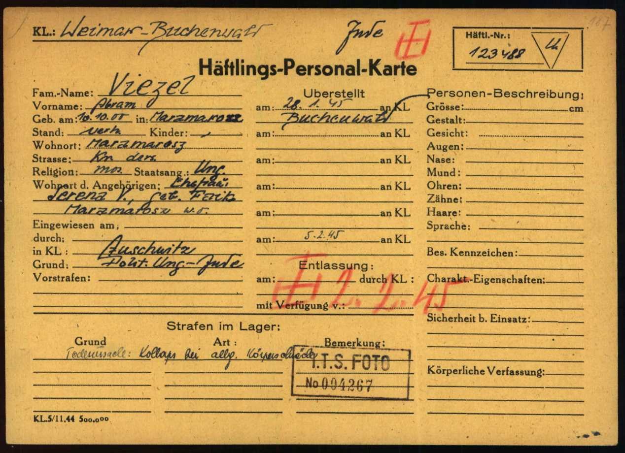 - A personal card from Buchenwald given to Abram Viezel, Buchenwald number 123488, death on 02.02.1945, official reason: collapse from general body weakness. Born in Sighet on 10.10.1900, wife: Serena Viezel née Feik.