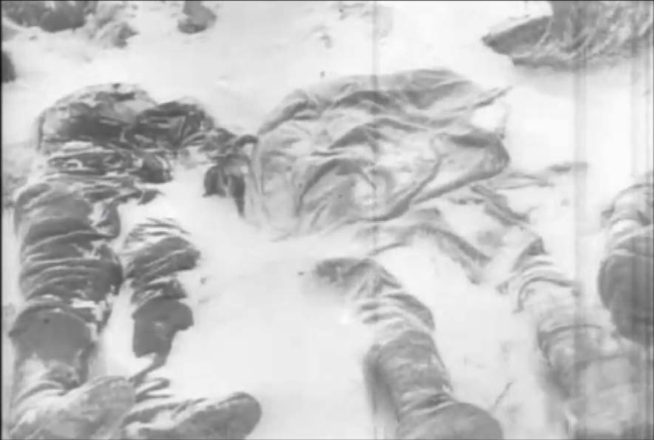 The images shown in this article are stills from the Soviet documentary, which can be enlarged by clicking on them. This is not recommended for sensitive persons as the images are sometimes very graphic. Like the documentary itself, they nevertheless show but a minuscule part of the crimes committed on Soviet territory by the Nazi invaders, and even of the crimes that occurred at the locations filmed – crimes against Soviet prisoners of war and civilians, Jews and non-Jews. The Jews among the murder victims shown are never referred to as such, presumably pursuant to the Soviet policy of not "dividing the dead" and not acknowledging that the Jews' fate under Nazi occupation was different from that of other Soviet nationalities. To the documentary's Soviet commentator, all civilian victims were simply "Soviet citizens".