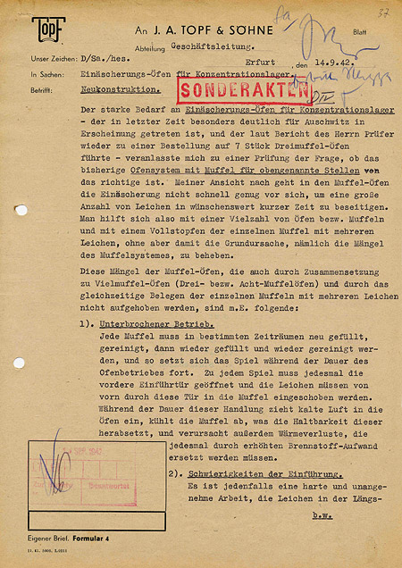 - Letter from Kurt Prüfer of 8 September 1942 on "the number of muffles [37 with a capacity of 1850 corpses per day] is not yet sufficient; we should deliver more ovens as quick as possible" [Schüle, Industrie und Holocaust, p. 442]