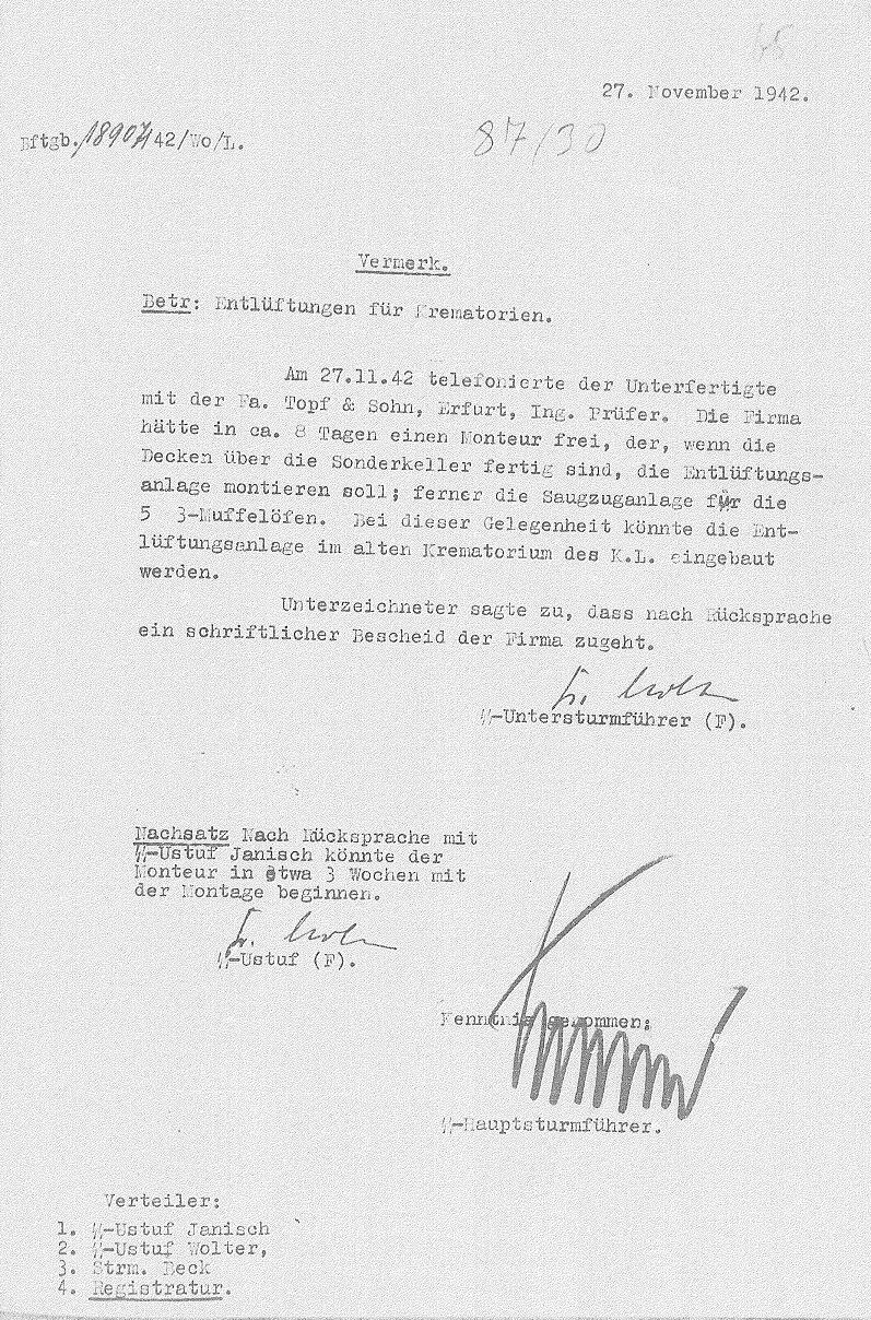 - Memo from Fritz Wolter of 27 November 1942 on “special cellars” in crematorium 2 [Schüle, Industrie und Holocaust, p. 180]