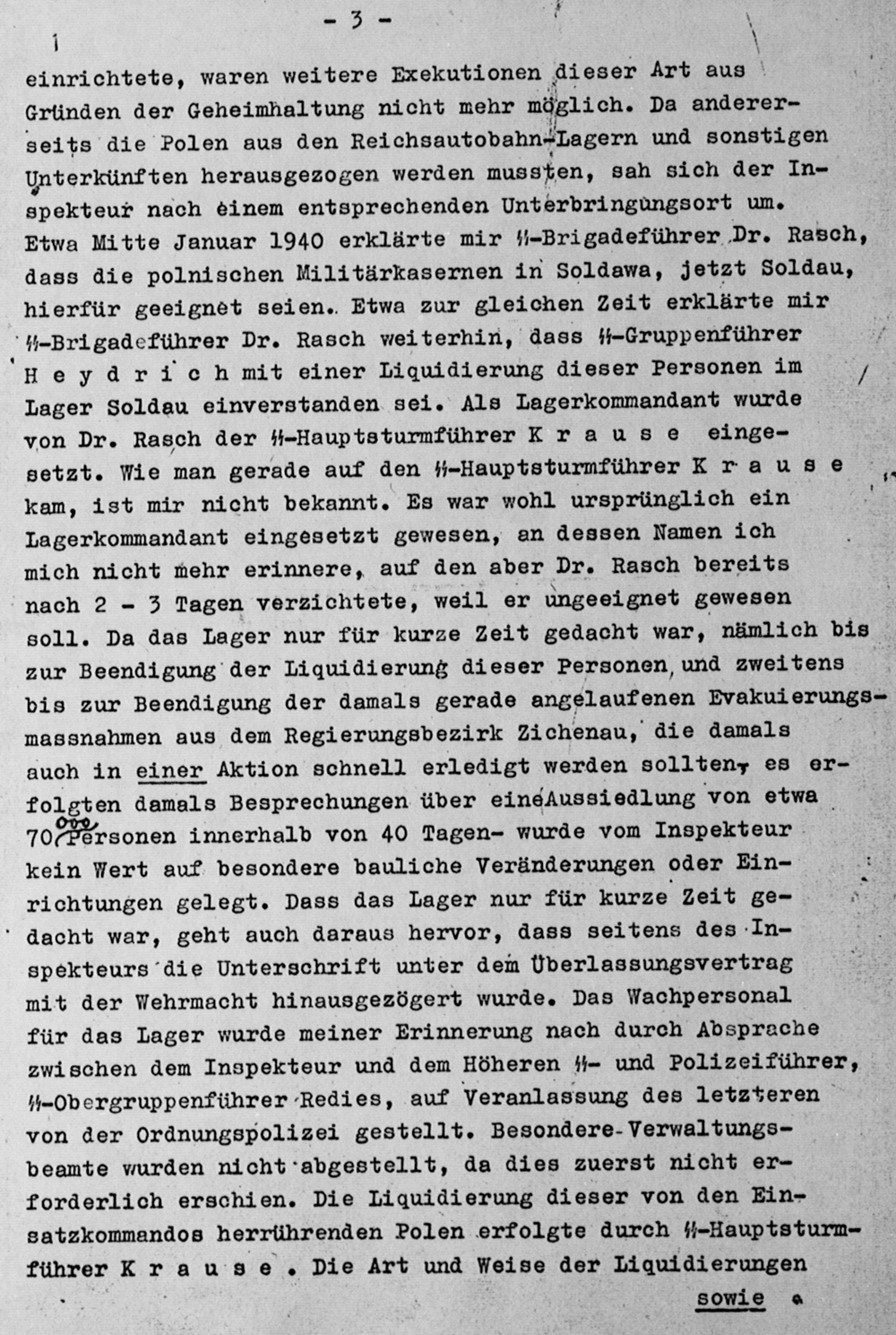These mentally ill people were not transited through Soldau but killed at the spot as it is borne out by the files of the later SS internal investigation against the Soldau commandant Hans Krause. According to the interrogation protocol of Friedrich Schlegel of the Inspecteur of the Security Police and SD in East Prussia of 3 June 1943, Soldau was established as camp for the "liquidation of these persons [Polish intelligentsia]" and "the mentally ill prisoners, who had been sent on special order, were liquidated by a special Kommando of the Inspector of Posen, under the constant supervision of SS-Obergruppenführer Redies[s]" (document 11). His superior Otto Rasch confirmed in his interrogation of 16 June 1943 that "in the winter, 1939/40, I had established the Soldau transit camp especially for the purpose of carrying out unostentatiously the liquidations [of Polish intelligentsia]" and that "insane persons were transferred to the camp on special order and shot" (document 12).